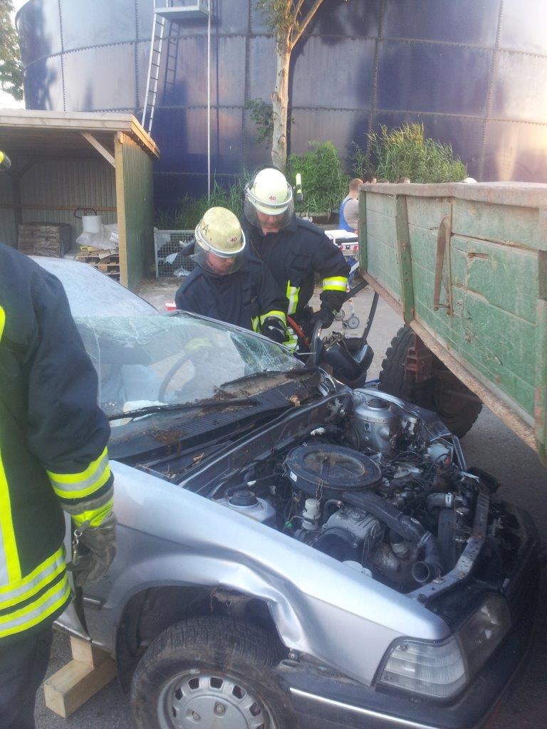 Bei der Übung auf dem Hof Heisch am 9. August 2013 konnten wir gemeinsam mit dem Deutschen Roten Kreuz das Befreien einer eingeklemmten Person üben, vielen Dank dafür an dieser Stelle. Das Übungsszenario war ein Kraftfahrzeug welches mit überhöhter Geschwindigkeit mit einem landwirtschaftlichen Anhänger zusammengestoßen ist, die Fahrerin wurde eingeklemmt. Die Besatzung von unserem Löschfahrzeug und unseren Tanklöschfahrzeug haben die Person befreit und die Besatzung des Rettungswagens hat sie medizinisch betreut.