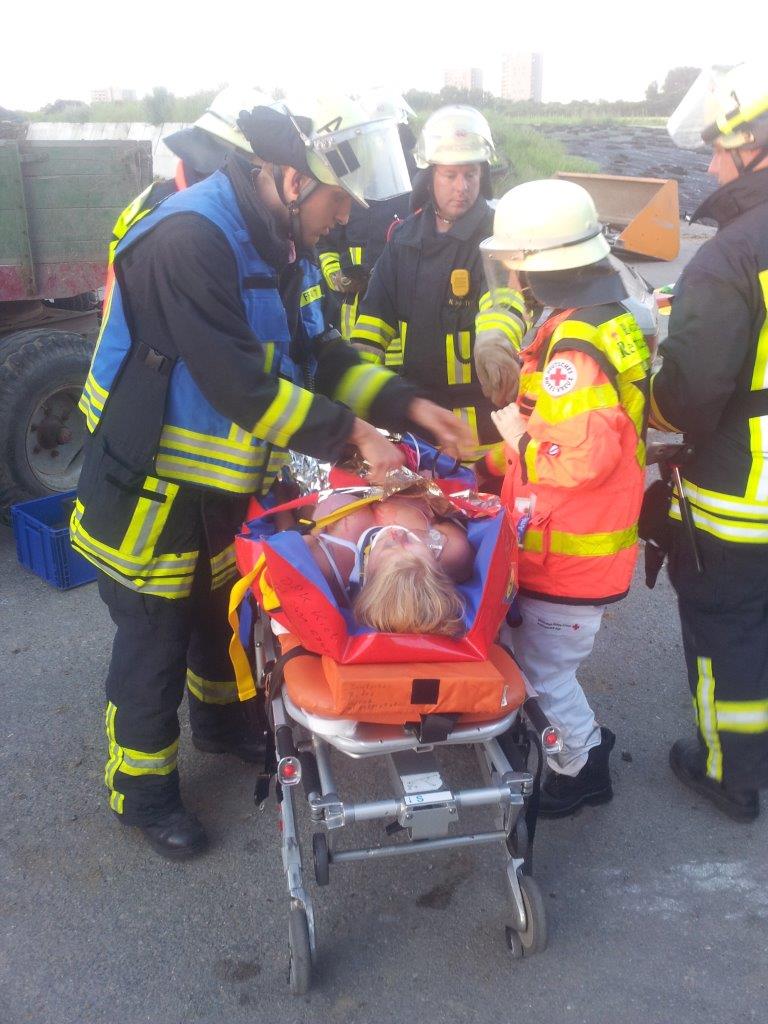 Die Person wurde durch die Rettungsöffnung durch Rettungsdienst und Feuerwehr aus dem Fahrzeug gehoben und auf die Vakuummatratze gebettet.