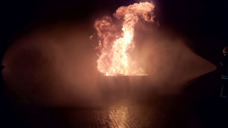 2x2m große Wanne mit Diesel, das Feuer wird durch 2 Trupps mit Sprühstrahl bekämpft