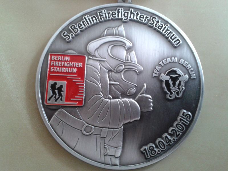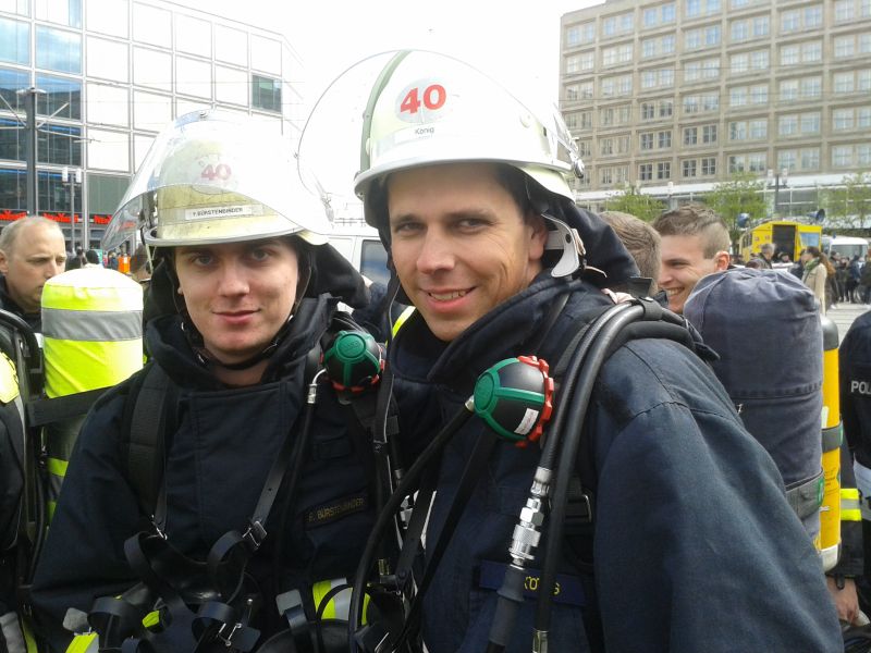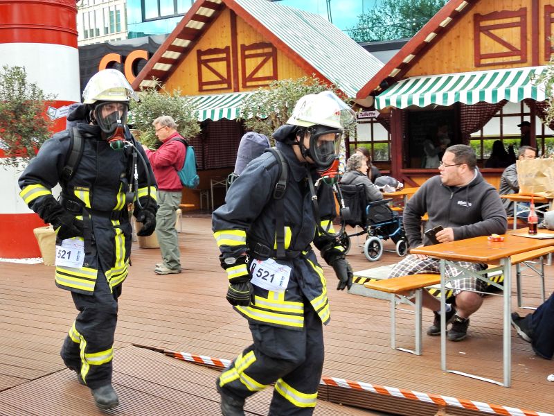 770 Stufen, 39 Stockwerke unter Atemschutz in voller Schutzausrüstung – das war die Aufgabe, zu der die Kameraden Fynn Bürstenbinder und Kai König gemeinsam mit Niels Philip Kögler und Jörg Damm angetreten waren. Am Samstag, den 18. April 2015, traten sie in Berlin zu diesem Wettbewerb an. Teilnehmer aus ganz Deutschland und einigen europäischen Ländern trafen sich in Berlin auf dem Alexanderplatz, um durch das Treppenhaus im Park Inn Hotel zu laufen. Blockweise ging es zum Start – begleitet durch Dudelsackmusik als Ansporn. Dann starteten alle Teilnehmer im 30 Sekunden-Takt zunächst für 300m außerhalb des Hotels – und dann die 39 Stockwerke bis nach oben auf die Aussichtsplattform.