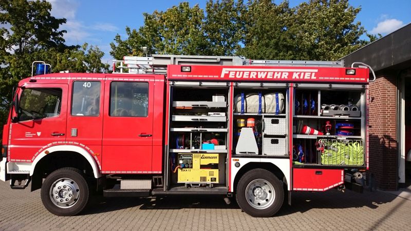 Der Mercedes mit der Bezeichnung „HLF 20/16“ (Hilfeleistungslöschgruppenfahrzeug mit einer Pumpenleistung von 2000l pro Minute und 1600l Wassertank, tatsächlich sogar 2000l) – war bislang auf der Hauptfeuerwache der Berufsfeuerwehr Kiel am Westring stationiert. Das 2004 gebaute Fahrzeug wurde umfangreich überholt und neu lackiert. Es ist neben der Beladung zur Brandbekämpfung auch mit hydraulischem Rettungsgerät zur Hilfeleistung bei Verkehrsunfällen, einem Lüfter, einem Schlauchboot und einem Wassersauger ausgestattet. Das hydraulische Rettungsgerät, dass vom LF 16/12 der FF Schilksee übernommen wurde, soll mittelfristig durch ein neueres Gerät ersetzt werden. Neun Feuerwehrleute finden in der Kabine Platz. Das Fahrzeug hat 280 PS und ein Automatikgetriebe, so dass sich der Fahrer während Einsatzfahrten voll auf den Verkehr konzentrieren kann.