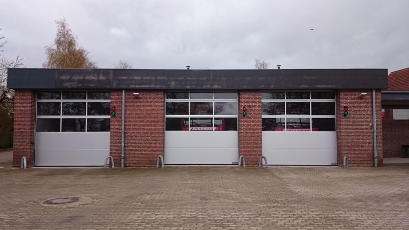 Unser Feuerwehrhaus hat neue Tore erhalten. Die alten Toren mit Kettenzug von 1982 wurde durch moderne Tore mit elektrischem Antrieb ersetzt. Zukünftig wird es möglich sein, die Tore mit einer Fernbedienung aus den Fahrzeugen heraus zu öffnen und zu schließen. Die vorgeschriebenen „Ampeln“ sorgen für Sicherheit. Die Tore sind nicht nur praktisch, sondern bieten auch wesentlich mehr Tageslicht in der Halle.