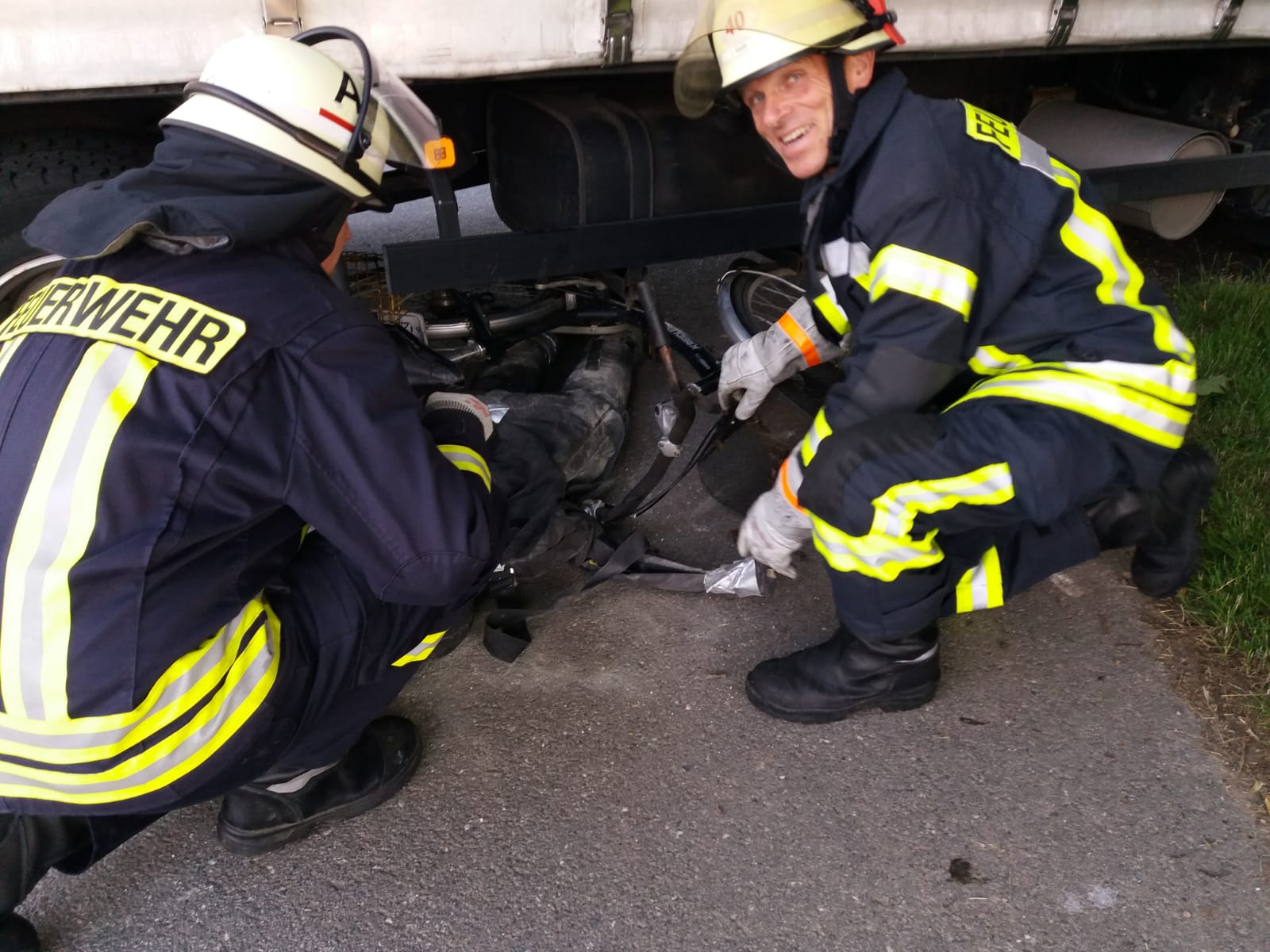 Foto: Bei dieser Übung lag eine Person unter einem LKW. Hier ist ein schnelles, aber sicheres Vorgehen notwendig.