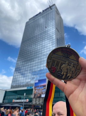 Schweißtriefend und mit brennenden Oberschenkeln kämpften sich beide Teams durch das enge Treppenhaus und erreichten nach 9:30.5 Minuten den 71. Platz (Sturm / Swolana) und nach 12:03.8 Minuten (Volkmann / Damm – Platz 217) die Aussichtsplattform des ParkInn-Hotels. Unter voller Adrenalin nahmen wir die hart erkämpften Medaillen im Empfang und erholten uns bei herrlichem Blick über Berlin.