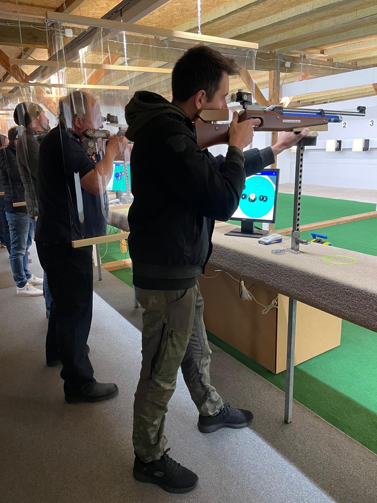 Mit fünf Kamerad*innen waren wir um 17:00 Uhr vor Ort und durften nach der Einweisung erst Luftgewehr und dann Kleinkaliber schießen.
